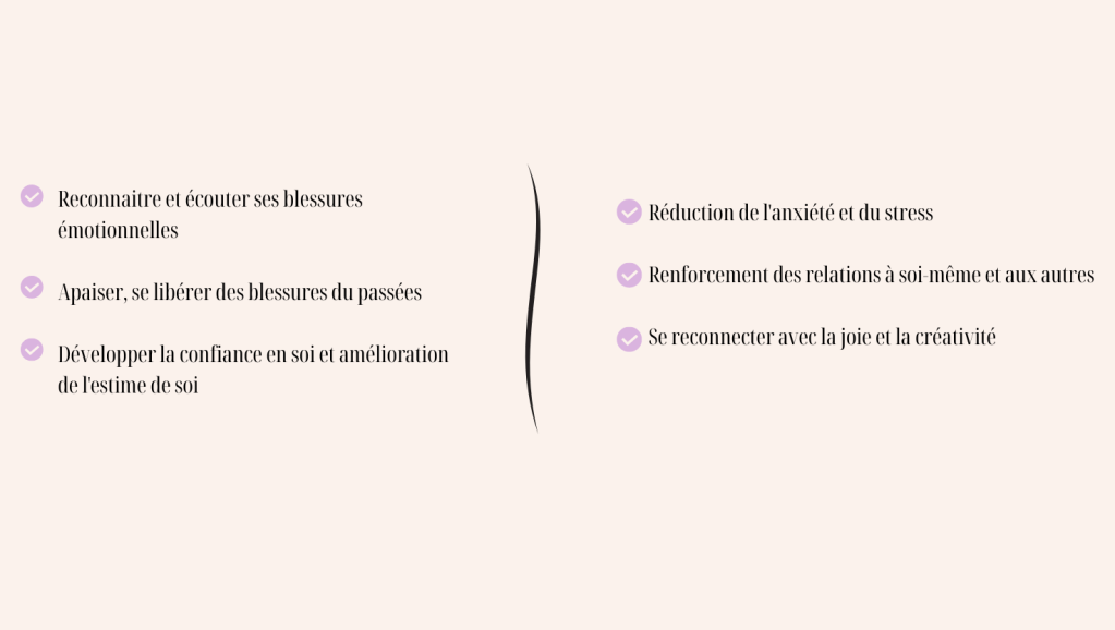 - Apaiser, se libérer des blessures du passées : créer un dialogue avec l’enfant Intérieur pour lui témoigner la sécurité et l’amour qui lui ont peut-être manqué